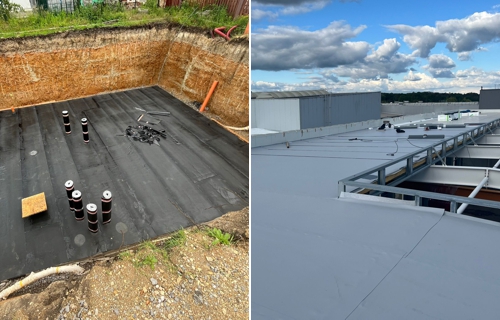 Horizontální i vertikální hydroizolace základů a suterénů, utěsnění balkonů a teras, aplikace střešní fólie a pojistné hydroizolace.