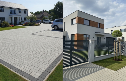 Kompletní realizace oplocení včetně montáže bran a branek, pokládky zámkové dlažby pro příjezdové cesty, chodníky a terasy.